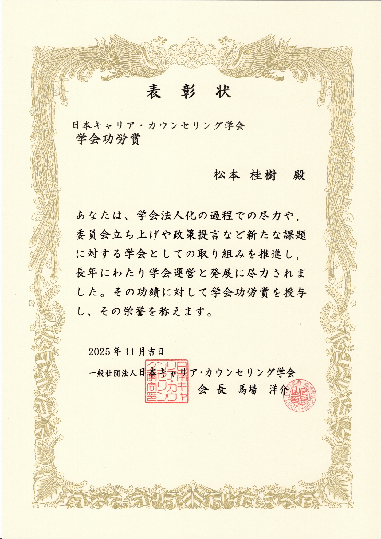 JESからのお知らせ 日本キャリア・カウンセリング学会より学会功労賞を授与されました 日本キャリア・カウンセリング学会より学会功労賞を授与されました 2025年11月22日、日本キャリア・カウンセリング学会第30回記念大会において、当社取締役 松本 桂樹 が「学会功労賞」を授与されました。 長年にわたりキャリアカウンセリングの発展に尽力してきた 功績が評価されたものです。 今後とも、キャリア支援の質向上に努めてまいります。 [2025/11/27] お知らせ一覧に戻る